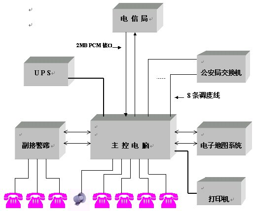 電信局交換機(jī)提供單獨數(shù)字2MB PCM中繼接口,通過HDSL傳輸設(shè)備或光端機(jī)設(shè)備將中繼接口連接到公安局指揮中心。若電信局與公安局距離小于500米,則可直接使用75歐姆電纜將中繼接口連接到公安局指揮中心。 該數(shù)字2MB PCM中繼接口的數(shù)據(jù)可以作成110/119/122混合編程,數(shù)據(jù)采用收全碼方式,被叫控制掛機(jī)。