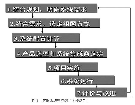 在規(guī)劃了呼叫中心戰(zhàn)略、客服組織架構(gòu)、客服流程與客服績效考評(píng)之后,呼叫中心系統(tǒng)的建設(shè)就有了戰(zhàn)略層面的規(guī)劃和運(yùn)營管理層面的指導(dǎo),而對(duì)戰(zhàn)略管理和運(yùn)營管理方面的支持則有賴于客服系統(tǒng)的建立。在戰(zhàn)略管理和運(yùn)營管理指導(dǎo)下的客服系統(tǒng)如何具體建立呢?下面分七個(gè)步驟來分別說明: