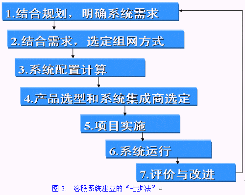 在規(guī)劃了呼叫中心戰(zhàn)略、客服組織架構(gòu)、客服流程與客服績效考評之后,呼叫中心系統(tǒng)的建設(shè)就有了戰(zhàn)略層面的規(guī)劃和運營管理層面的指導,而對戰(zhàn)略管理和運營管理方面的支持就有賴于客服系統(tǒng)的建立?头到y(tǒng)建立的"七步法"如下圖所示: