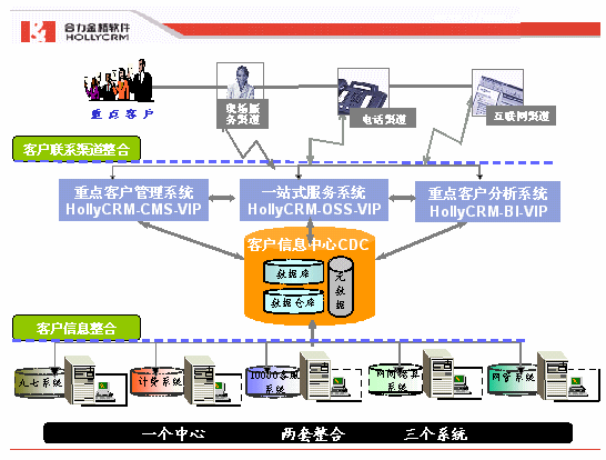 HOLLYCRM(合力金橋軟件)基于電信行業(yè)IT發(fā)展和山東省通信公司重點(diǎn)客戶管理系統(tǒng)建設(shè)目標(biāo)和原則的要求,根據(jù)多年來對(duì)電信CRM領(lǐng)域的研究以及在實(shí)際項(xiàng)目建設(shè)實(shí)施過程中的經(jīng)驗(yàn)獲得,科學(xué)地提出了針本項(xiàng)目的"一個(gè)中心,二套整合,三個(gè)系統(tǒng)"的建設(shè)理念。如下圖: