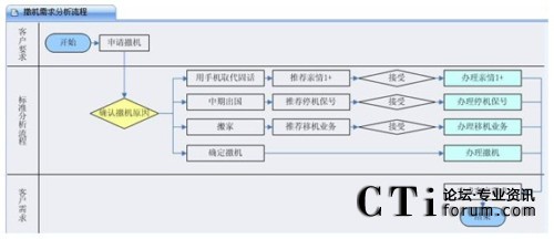 客戶呼入之后,座席人員要做的第一件事情就在IT系統(tǒng)的支持下先去捕獲客戶訴求,不用擔心座席會混淆相似的業(yè)務類型,因為呼叫中心針對典型的業(yè)務訴求會做出非常詳盡的引導流程,相似的或者關聯(lián)的業(yè)務類型在此流程中會體現(xiàn)出來,座席人員可以點擊,快捷地出入于各業(yè)務類型的引導圖,通過比較、判斷,最終定位出客戶真正訴求。例如下文客戶呼入本來想做“撤機”業(yè)務,通過業(yè)務引導圖,最終定位到了客戶的真正訴求,辦理了停機保號業(yè)務或者移機業(yè)務。