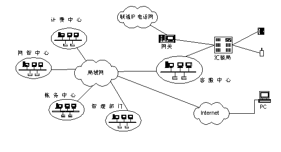 聯(lián)通北京分公司將客戶服務(wù)系統(tǒng)與現(xiàn)有計(jì)費(fèi)、營業(yè)、帳務(wù)系統(tǒng)進(jìn)行組織,形成了一個(gè)有機(jī)的結(jié)合體,能夠充分發(fā)揮出現(xiàn)有系統(tǒng)的優(yōu)勢?蛻舴⻊(wù)系統(tǒng)從營業(yè)帳務(wù)系統(tǒng)提取相關(guān)用戶資料,建立客戶服務(wù)的系統(tǒng)資料庫,從計(jì)費(fèi)系統(tǒng)提取相關(guān)用戶話費(fèi)資料等供查詢使用。同時(shí)客服系統(tǒng)還將與北京聯(lián)通現(xiàn)有的計(jì)費(fèi)、營業(yè)、帳務(wù)、網(wǎng)管等相關(guān)系統(tǒng)以及Internet相連,提供業(yè)務(wù)處理和用戶自助服務(wù)等業(yè)務(wù)。本客服中心通過2對路由器和DDN專線與聯(lián)通北京分公司現(xiàn)有的局域網(wǎng)(包括管理部門、網(wǎng)管中心、計(jì)費(fèi)中心、帳務(wù)中心等相關(guān)系統(tǒng))連接,并通過該局域網(wǎng)訪問Internet。