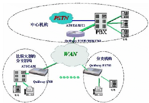 。。如圖是一個典型的企業(yè)網IP電話組網方案,在總部采用Quidway®R3640E/3680E路由器作為中心語音網關設備,在E1線路上實現VoIP功能;如果機構規(guī)模不是很大,也可以采用AT0/E&M連接PBX;在各分支機構及網點,則可采用Quidway®