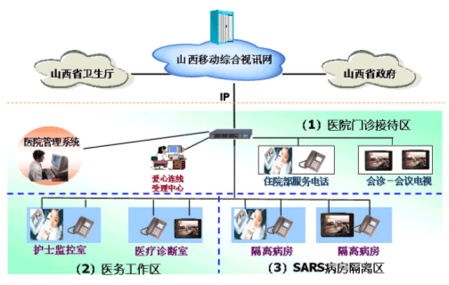 。。山西移動(dòng)通信公司在獲悉遠(yuǎn)程視訊業(yè)務(wù)可以有效預(yù)防SARS的情況下,隨即與山西省政府、省衛(wèi)生廳通電話,表達(dá)了山西移動(dòng)愿意為山西防治SARS工作提供更先進(jìn)的通信技術(shù)支持。山西移動(dòng)與華為技術(shù)有限公司旋即制定了“愛(ài)心連線”遠(yuǎn)程醫(yī)療、遠(yuǎn)程探視實(shí)施方案,省衛(wèi)生廳及下屬太原市7家醫(yī)院要求盡快實(shí)施。目前該系統(tǒng)已經(jīng)在山西省山大第一醫(yī)院開(kāi)通,正值國(guó)家衛(wèi)生部SARS督察小組在山西各大醫(yī)院視察“防非”工作,整個(gè)系統(tǒng)運(yùn)行穩(wěn)定,在SARS的防治工作中發(fā)揮了重要作用。