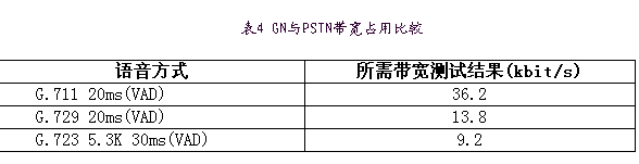 為進(jìn)一步節(jié)省帶寬,又采用語(yǔ)音激活檢測(cè)技術(shù)(VAD)及舒適噪音生成(CNG)技術(shù),VAD技術(shù)只有當(dāng)檢測(cè)到語(yǔ)音處于活動(dòng)狀態(tài)時(shí),編碼器的輸出信號(hào)才被送到網(wǎng)絡(luò)上,因此節(jié)省了帶寬。而在靜音時(shí)段采用CNG技術(shù),生成與背景噪聲相匹配的較舒適的靜音,避免了用戶有不自然的交談感覺,保證通話質(zhì)量。實(shí)際測(cè)試結(jié)果如表4,采用G.72920ms打包+VAD技術(shù)節(jié)省了近75%的帶寬。