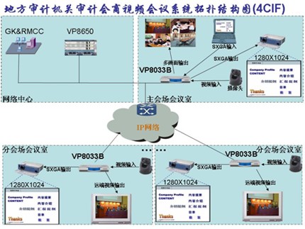 本系統(tǒng)在審計(jì)署機(jī)房配置網(wǎng)絡(luò)控制中心GK、多點(diǎn)資源管理系統(tǒng)和ViewPoint 8660 MCU設(shè)備。多點(diǎn)資源管理中心實(shí)現(xiàn)對MCU、電視會議和全網(wǎng)資源的統(tǒng)一調(diào)度,GK實(shí)現(xiàn)對IP終端入會時鑒權(quán)認(rèn)證,在主會場會議室架設(shè)一臺ViewPoint 8033B分體式視訊終端。在各分會場會議室架設(shè)一臺ViewPoint 8033B分體式視訊終端;在所有會場各架設(shè)一臺標(biāo)清攝像機(jī)、一個麥克風(fēng)、一臺高清電視或一臺高清投影機(jī)。