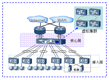 如上圖所示,整個數(shù)據(jù)中心網(wǎng)絡(luò)通過虛擬集群技術(shù),多個核心層設(shè)備虛擬為一臺設(shè)備。通過增加核心節(jié)點,提供無阻塞的網(wǎng)絡(luò)能力,接入更多服務(wù)器。服務(wù)器的規(guī)?梢詮3000臺“無級擴展”到數(shù)萬臺。在滿足企業(yè)日益增長的業(yè)務(wù)需求的同時,并不增加網(wǎng)絡(luò)的復(fù)雜度,減少管理和維護的成本。