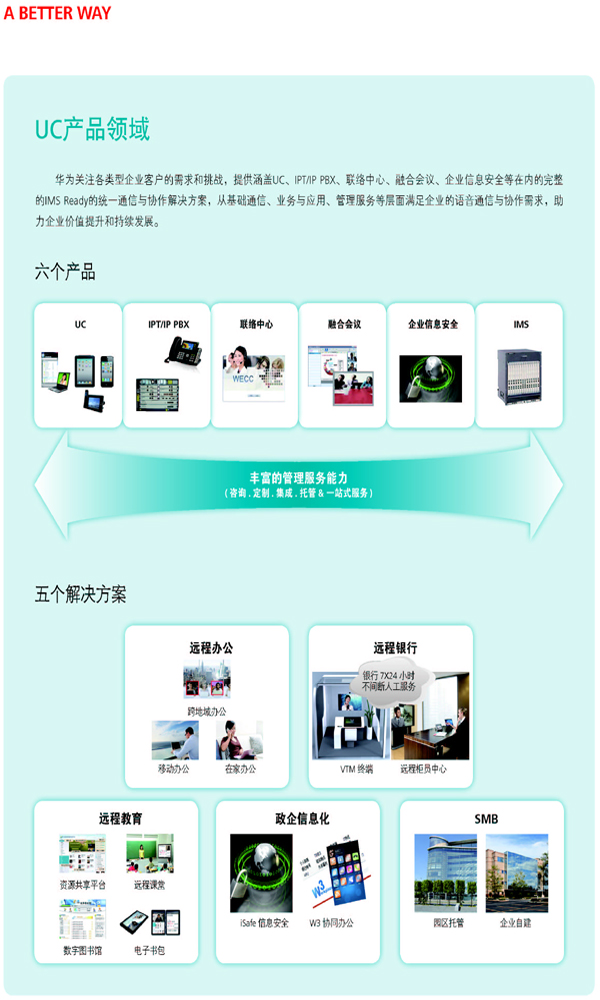 華為是全球領(lǐng)先的信息與通信解決方案供應(yīng)商。為適應(yīng)信息行業(yè)正在發(fā)生的革命性變化,華為做出面向客戶的戰(zhàn)略調(diào)整,華為的創(chuàng)新將從電信運(yùn)營(yíng)商網(wǎng)絡(luò)向企業(yè)業(yè)務(wù)、消費(fèi)者領(lǐng)域延伸,協(xié)同發(fā)展“云-管-端”業(yè)務(wù)。