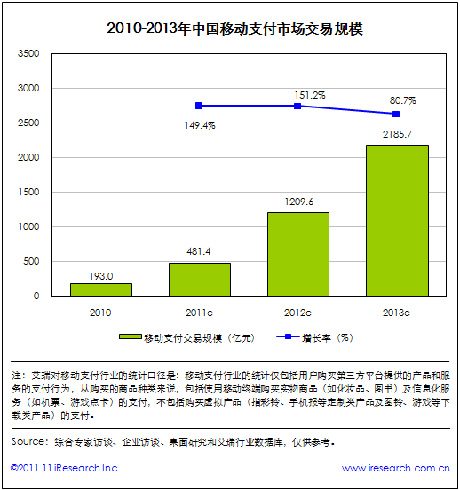 艾瑞咨詢數(shù)據(jù)顯示,截至2011年底,中國(guó)移動(dòng)支付交易規(guī)?傤~將達(dá)到481.4億元,同比增長(zhǎng)149.4%,整體呈現(xiàn)爆發(fā)式的增長(zhǎng)態(tài)勢(shì)。艾瑞預(yù)計(jì),中國(guó)移動(dòng)支付交易規(guī)模將在2013年底超過(guò)2000億元。