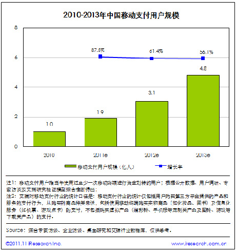 根據(jù)艾瑞咨詢統(tǒng)計(jì)數(shù)據(jù),2011年中國(guó)移動(dòng)支付用戶規(guī)模將達(dá)到1.9億。艾瑞預(yù)計(jì),2013年中國(guó)移動(dòng)支付用戶規(guī)模將達(dá)到4.8億。移動(dòng)網(wǎng)上支付用戶規(guī)模的增長(zhǎng)帶動(dòng)了整個(gè)行業(yè)用戶規(guī)模的爆發(fā),另外手機(jī)短信支付也在用戶群體中得到了進(jìn)一步的普及。