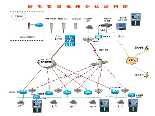 整個(gè)視頻會(huì)議系統(tǒng)是基于H.323,集團(tuán)本部中心放置9個(gè)視頻終端,其中包括2臺(tái)大型會(huì)議終端VS4000,2臺(tái)ViewStation FX,5臺(tái)ViewStation 128,集團(tuán)下屬60個(gè)電廠均采用視頻終端ViewStation 128。整個(gè)網(wǎng)絡(luò)采用Polycom MCU的混速功能,在本部中心采用768Kbps進(jìn)行視頻傳輸,和下屬60個(gè)電廠及分公司采用128Kbps進(jìn)行傳輸。由于網(wǎng)絡(luò)傳輸線路分為衛(wèi)星線路和地面有線網(wǎng)絡(luò),衛(wèi)星線路帶寬為768Kbps-1Mbps,用于業(yè)務(wù)下行線路,地面有線網(wǎng)絡(luò)128Kbps用于視頻回傳。根據(jù)網(wǎng)絡(luò)傳輸線路的實(shí)際情況,在本部中心利用1臺(tái)視頻終端將其模擬信號(hào)(AV信號(hào))送到衛(wèi)星端接設(shè)備(包含MODEM,編解碼器等),將模擬信號(hào)轉(zhuǎn)換成數(shù)字信號(hào)(MPEG4),利用768K-1Mbps衛(wèi)星線路廣播到每個(gè)接收點(diǎn),通過(guò)每個(gè)接收點(diǎn)的編解碼器將數(shù)字信號(hào)轉(zhuǎn)換成模擬信號(hào)連接到顯示終端(如TV、顯示器)上進(jìn)行收看,通過(guò)這種方式可以實(shí)現(xiàn)利用衛(wèi)星線路的高帶寬,并利用其廣播特性,節(jié)省投資。