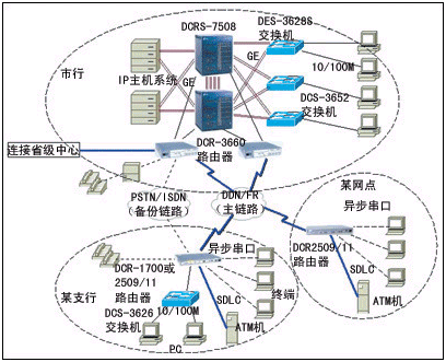 對(duì)于業(yè)務(wù)比較少的網(wǎng)點(diǎn),使用DCR-2501或DCR-2509路由器;對(duì)于業(yè)務(wù)比較多的網(wǎng)點(diǎn),使用DCR-2511或DCR-1720或DCR-1750路由器。營業(yè)網(wǎng)點(diǎn)使用DCR-2500或1700系列路由器,既實(shí)現(xiàn)柜員終端、IP業(yè)務(wù)等綜合業(yè)務(wù)接入,又能用以太口將辦公網(wǎng)絡(luò)連接起來,實(shí)現(xiàn)真正的綜合業(yè)務(wù)接入。原有遠(yuǎn)程終端可以直接連在DCR-2500或1700系列路由器上,通過IP網(wǎng)絡(luò)訪問網(wǎng)絡(luò)內(nèi)任意位置的業(yè)務(wù)前置機(jī),無須改動(dòng)原有業(yè)務(wù)軟件,輕松實(shí)現(xiàn)銀行綜合業(yè)務(wù)。終端通過上述路由器可訪問支行和分行不同局域網(wǎng)上的多臺(tái)前置機(jī),訪問時(shí),不需要調(diào)用前置機(jī)的TELNET服務(wù),且終端號(hào)固定。