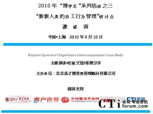 21世紀(jì)什么是貴?人才最貴!人才是企業(yè)持續(xù)發(fā)展的唯一生命之源。易才博普奧公司(CTG BPO)作為專業(yè)的人力資源外包專家、服務(wù)外包產(chǎn)業(yè)專業(yè)人才租賃供應(yīng)商,近年來在業(yè)界積累了大量優(yōu)秀的一線人才租賃經(jīng)驗(yàn)并得到廣泛的業(yè)界好評!2010年伊始,易才博普奧推出了“博學(xué)匯”系列客戶交流會活動,旨在搭建一個與行業(yè)精英、業(yè)內(nèi)專家互動交流的平臺,學(xué)習(xí)、體驗(yàn)和分享多元文化,促進(jìn)和推動彼此之間的交流與合作。