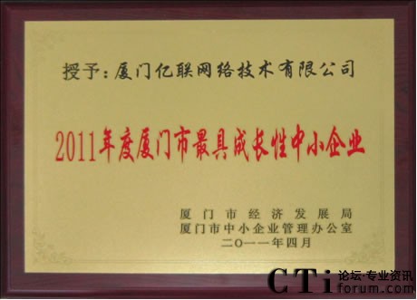 億聯(lián)喜獲2011年廈門(mén)市最具成長(zhǎng)性中小企業(yè)獎(jiǎng)