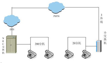 據(jù)了解,該門業(yè)企業(yè)本次將北京的兩個辦公地點(總部和廠區(qū))率先進行了嘗試。之前兩處均NEC交換機,中繼為電信DID接入(線數(shù):300+)尚有20個號碼可用。企業(yè)希望能加強通訊管理,將廠區(qū)通訊系統(tǒng)與總部通訊系統(tǒng)合二為一,費用和管理均在總部進行。