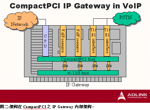 如何實(shí)現(xiàn)如此多功能的IP Gateway如圖二架構(gòu),在CompactPCI標(biāo)準(zhǔn)的背板上,整合了計(jì)算機(jī)電話(huà)領(lǐng)域常用的標(biāo)準(zhǔn)H.110 bus,提供冗余時(shí)鐘支持熱插拔板卡如VoIP、FoIP、T1/E1