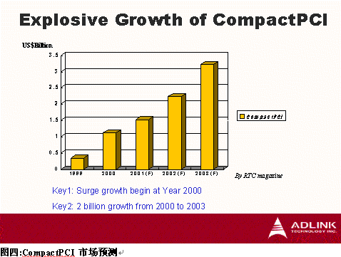 Magazine 估計(jì),CompactPCI市場(chǎng)將由1999年的美金$350 Million成長(zhǎng)到2003年的美金$3200 Million,年復(fù)合成長(zhǎng)率高達(dá)45.6%,其中又以2002年至2003年最大幅成長(zhǎng)。CompactPCI為工業(yè)計(jì)算機(jī)產(chǎn)業(yè)開(kāi)拓了一個(gè)以往傳統(tǒng)工業(yè)計(jì)算機(jī)無(wú)法應(yīng)用的新市場(chǎng),而CompactPCI需針對(duì)電信等級(jí)應(yīng)用提供高可靠度及達(dá)到嚴(yán)苛高品質(zhì)要求,卻又為傳統(tǒng)工業(yè)計(jì)算機(jī)廠商豎立高進(jìn)入障礙,因此,目前能提供電信級(jí)CompactPCI寬頻通訊平臺(tái)幾為國(guó)外廠商,如Motorola、Ziatech、Force