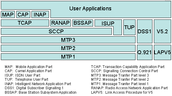 圖中MAP,CAP,RANAP,BSSAP為移動通信系統(tǒng)使用的信令;ISUP,TUP,INAP為固定網使用的信令;DSS1和V5.2為接入網使用的信令。