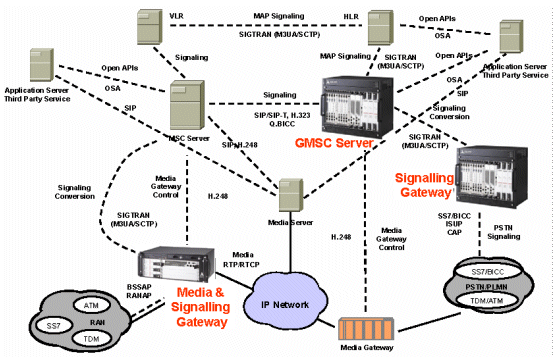在這個例子中媒體和信令網關(Media & Signalling Gateway)、移動交換中心網關服務器(GMSC Server)、拜訪位置寄存器(VLR)、歸宿位置寄存器(HLR)都集成了信令網關的功能,它們分別起到無線接入網的信令網關和漫游信令網關的作用。獨立設置的信令網關(Signalling