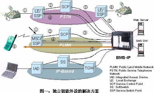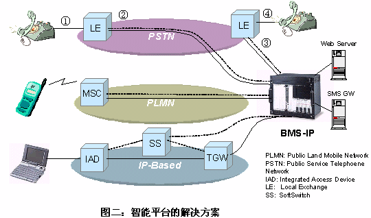 隨著通信發(fā)展,用戶對業(yè)務(wù)的多樣性、個(gè)性化和智能化的需求愈發(fā)緊迫。因此一種新業(yè)務(wù)在投入市場的時(shí)間,業(yè)務(wù)量和對現(xiàn)網(wǎng)設(shè)備改造等方面都提出了新的挑戰(zhàn)。智能業(yè)務(wù)平臺以分布接入、集中控制、業(yè)務(wù)擴(kuò)展靈活,可快速實(shí)現(xiàn)各類電信增值新業(yè)務(wù)的突出優(yōu)點(diǎn),滿足了人們對電信新業(yè)務(wù)的迫切需要。智能業(yè)務(wù)平臺投資小、見效快,是近年來實(shí)現(xiàn)增值業(yè)務(wù)的優(yōu)選方案。在固定和移動(dòng)、電信和IT融合的發(fā)展潮流中,它具有很大的想象空間。用智能業(yè)務(wù)平臺實(shí)現(xiàn)BMS的工作原理如圖二所示。