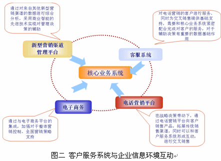 客戶服務(wù)系統(tǒng)不是孤立的系統(tǒng),是能夠與客戶現(xiàn)有信息環(huán)境,包括:核心業(yè)務(wù)系統(tǒng)、多渠道營銷、電子商務(wù)等進(jìn)行互動的智能信息系統(tǒng),從而使呼叫中心成為企業(yè)的戰(zhàn)略資產(chǎn),幫助企業(yè)提升客戶滿意度、深度挖掘客戶價(jià)值?蛻舴⻊(wù)系統(tǒng)與企業(yè)其它信息系統(tǒng)的互動可以通過圖二反映。