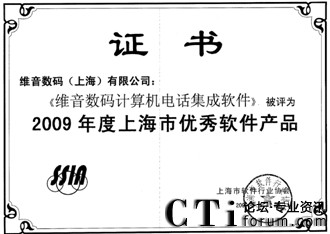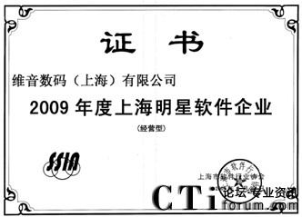 CTI論壇(ctiforum)10月19日消息: 金秋十月,捷報(bào)頻傳,由上海市軟件行業(yè)協(xié)會(huì)開展的2009年度上海明星軟件企業(yè)評(píng)選結(jié)果出爐,維音數(shù)碼不僅榮登:“2009年度上海明星軟件企業(yè)(經(jīng)營(yíng)型)”和“2009年度上海明星軟件企業(yè)(創(chuàng)新型)”獲獎(jiǎng)榜單,維音數(shù)碼自主研發(fā)的軟件產(chǎn)品VisionCTI(計(jì)算機(jī)電話集成系統(tǒng))更是被評(píng)定為“2009年度上海市優(yōu)秀軟件產(chǎn)品獎(jiǎng)”。