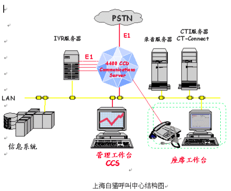隨著企業(yè)間相互競爭的加劇,用戶對企業(yè)服務要求的提高,越來越多的企業(yè)承諾為用戶提供一個24小時的客戶服務環(huán)境,用戶可以隨時獲得聲音、文字、文件等服務。而呼叫中心可為企業(yè)解決這些問題。阿爾卡特作為著名的企業(yè)通信產品供應商,可以為企業(yè)提供一套完整的多媒體呼叫中心平臺解決方案。上海白貓有限公司是國內著名的洗滌系列產品供應商,提供多種渠道為分銷商和用戶提供產品和服務。面對競爭對手,面對客戶的要求,上海白貓決定建設電子商務平臺,通過電話、傳真、郵件、網站各種接入手段,結合公司的物流系統(tǒng),倉庫管理,網站系統(tǒng),建立客戶關系管理,經營策略分析。從而鞏固其在同行業(yè)的地位,獲得更大的競爭力。阿爾卡特為上海白貓有限公司提供OmniPCX 4400交換機解決方案。采用CCD排隊軟件,采用CCS呼叫管理軟件。CTI中間件采用CT-Connect。