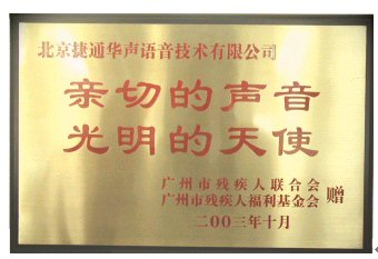 近日,廣州殘疾人聯(lián)合會授予了北京捷通華聲語音技術(shù)有限公司"親切的聲音,光明的天使"榮譽稱號,并頒發(fā)了金匾和榮譽證書,感謝捷通華聲為廣州的社會福利事業(yè)的近10萬元的捐獻與長期的技術(shù)支持。