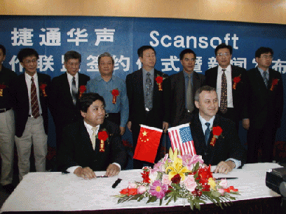 2004年5月20日,北京捷通華聲語音技術(shù)有限公司與美國Scansoft公司(Nasdaq:SSFT)宣布就語音技術(shù)全面合作達成戰(zhàn)略聯(lián)盟,雙方在北京正式簽署了合作協(xié)議,并舉行了新聞發(fā)布會。