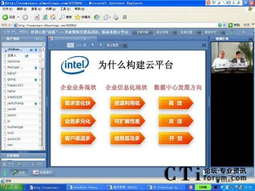 2011年3月25日,intel攜手V2威速租用型視頻會(huì)議,針對(duì)構(gòu)建云計(jì)算平臺(tái),展開了一場(chǎng)主題為“找到云的“高低”——開放架構(gòu)支撐高靈活、低成本的云平臺(tái)”別開生面的線上研討會(huì)。在此之前,V2威速租用型視頻會(huì)議曾多次攜手intel、EMC、APC、SAP等成功開展線上研討會(huì);顒(dòng)的成功舉辦為intel提供了一個(gè)良好的與客戶交流溝通的平臺(tái)。