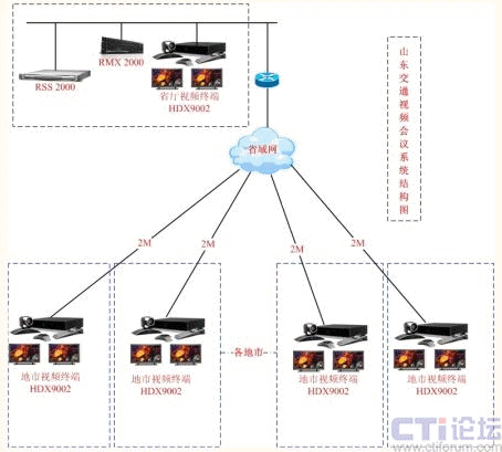 山東省交通廳高清視頻會(huì)議系統(tǒng)架構(gòu)在一個(gè)完善的、高性能的TCP/IP網(wǎng)絡(luò)基礎(chǔ)之上,基于交通廳全新開(kāi)通的2M專(zhuān)線光纖網(wǎng)絡(luò),以省交通廳為主會(huì)場(chǎng),全省各地市交通局(委)為分會(huì)場(chǎng),共18個(gè)會(huì)場(chǎng)。