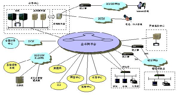 縣計費(fèi)中心采用64K DDN連接各營業(yè)廳和支局,縣銀行通過銀行網(wǎng)絡(luò)連入企業(yè)網(wǎng)平臺,鄉(xiāng)鎮(zhèn)代收點(diǎn)視具體條件的不同可采用DDN、ISDN或PSTN方式連入計費(fèi)中心。