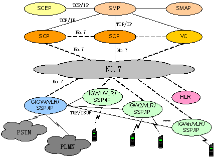 中興PCS智能網(wǎng)可根據(jù)用戶需要采用多種靈活的組網(wǎng)方案,既可全省或多地區(qū)集中建設(shè)一套平臺,充分節(jié)約投資和快速進(jìn)行業(yè)務(wù)提供,又可按地市單獨建設(shè),充分保證業(yè)務(wù)的靈活性。系統(tǒng)支持與其他PCS網(wǎng)絡(luò)的良好互通,可同時為其它系統(tǒng)提供PCS智能業(yè)務(wù)。中興PCS智能網(wǎng)基于No.7信令與交換網(wǎng)絡(luò)連接,不占用話路資源,采用嵌入式組網(wǎng),智能業(yè)務(wù)采用簽約信息觸發(fā),SSP(Service Switch Point)和SCP(Service Control Point)之間采用No.7信令進(jìn)行通信,在這種組網(wǎng)方式下,不存在話路迂回,有效節(jié)約運營商寶貴的網(wǎng)絡(luò)資源,并可以根據(jù)簽約信息靈活開展多種智能業(yè)務(wù),智能網(wǎng)信令也能很好地支持用戶的移動性,給用戶提供更靈活、方便和個性化的服務(wù)。