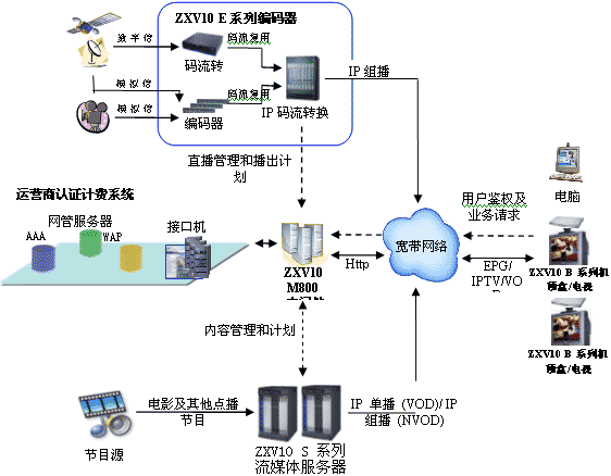 中興通訊ZXV10 IPTV/VOD整體解決方案是專(zhuān)門(mén)針對(duì)電信運(yùn)營(yíng)商多媒體服務(wù)而設(shè)計(jì)的綜合解決方案。該系統(tǒng)可提供網(wǎng)絡(luò)電視(IPTV)、視頻點(diǎn)播(VOD)、準(zhǔn)視頻點(diǎn)播(NVOD)、電子節(jié)目指南(EPG)等多種寬帶多媒體業(yè)務(wù),系統(tǒng)全面支持xDSL和FTTx接入,支持MPEG2、MPEG4、WMV9等多種視音頻格式,在為運(yùn)營(yíng)商提供具有極高競(jìng)爭(zhēng)力的、特色鮮明服務(wù)的同時(shí),最大限度地提高運(yùn)營(yíng)商的收入。