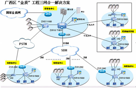 憑借全面的融合通信產(chǎn)品和解決方案、豐富的電子政務(wù)工程建設(shè)和實(shí)施經(jīng)驗(yàn),中興通訊為廣西“金質(zhì)工程”(一期)系統(tǒng)“量身定做”出一整套基于IP融合、使用方便靈活的解決方案:將整個(gè)系統(tǒng)分為兩個(gè)部分,即區(qū)質(zhì)監(jiān)局一級(jí)節(jié)點(diǎn)信息中心、各地市質(zhì)監(jiān)局及相關(guān)研究機(jī)構(gòu)共計(jì)15個(gè)二級(jí)節(jié)點(diǎn)信息中心,在管理上體現(xiàn)垂直的系統(tǒng)架構(gòu)。整個(gè)網(wǎng)絡(luò)可以看作一個(gè)分級(jí)的星形網(wǎng)絡(luò),結(jié)構(gòu)簡(jiǎn)單、易于擴(kuò)展。