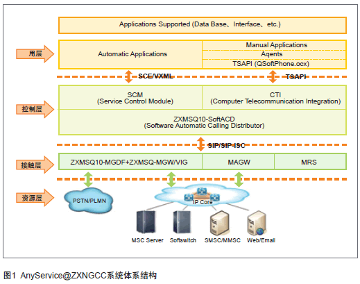 中興通訊AnyService@ZXNGCC多媒體統一接觸中心系統以中興通訊ZXMSQ10多媒體軟排隊機系統為基礎,基于軟交換技術。ZXMSQ10由接入網關和軟排隊機兩個核心部件組成,語音、視頻呼叫(呼入和呼出)通過ZXMSQ10多媒體軟排隊機匯聚到AnyService@ZXNGCC系統,其他媒體通過MAGW接入到NGCC系統,同時AnyService@ZXNGCC也選擇最佳的媒體類型將信息主動反饋給用戶,形成雙向溝通的渠道,實現呼叫中心系統的被動服務和主動服務。