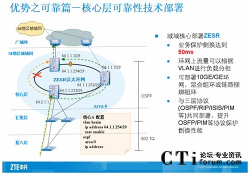 核心交換機主要是匯聚下行的全千兆智能路由交換機,所以要求設(shè)備提供高密度板卡和線速轉(zhuǎn)發(fā)的能力。同時保證對下行端口進行帶寬控制,中興采用萬兆路由交換機ZXR10 8905來滿足用戶的需求。ZXR10 8900系列萬兆路由交換機是中興通訊推出的新一代的大容量核心/匯聚路由交換機系列產(chǎn)品,主要定位于運營商IP城域網(wǎng)、校園網(wǎng)、電子政務(wù)網(wǎng)和大型企事業(yè)網(wǎng)等網(wǎng)絡(luò)的核心/匯聚層。ZXR10 8900系列萬兆路由交換機基于先進的模塊化理念進行設(shè)計,并采用了基于多處理器并行處理機制和Crossbar空分交換結(jié)構(gòu)的體系結(jié)構(gòu),關(guān)鍵模塊均采用可以1:1進行冗余備份。ZXR10 8900系列具備10GE、GE、FE等各種豐富的接口模塊,并全面支持IPv4、IPv6、組播、QOS、帶寬控制等業(yè)務(wù)功能。ZXR10 8900系列整個系統(tǒng)所具備的高可靠性、高擴展性、良好的業(yè)務(wù)能力等特點,可以滿足各種網(wǎng)絡(luò)核心/匯聚層的建設(shè)需求。