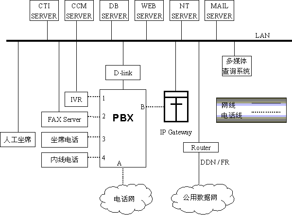 上圖所示的分布于不同地區(qū)的多個系統(tǒng)可以互相聯(lián)接,構(gòu)成分布式客戶服務(wù)中心,如地市話務(wù)員回答不了客戶的問題,可轉(zhuǎn)接到省中心,話務(wù)員在坐席上操作請求CCM轉(zhuǎn)接省中心,CCM通過CTI SERVER控制PBX將A與B接通,IP網(wǎng)關(guān)響應(yīng)呼叫,將電話號碼信號翻譯成相關(guān)的IP地址,將線路上的語音信號處理成數(shù)據(jù)信息并打包,通過本地LAN、本地ROTUER、公用數(shù)據(jù)網(wǎng)、省中心LAN等發(fā)送到省中心的IP網(wǎng)關(guān)、呼叫到達(dá)省中心PBX的B,按省中心系統(tǒng)的排隊和選擇坐席的規(guī)則選擇坐席,省中心的IP網(wǎng)關(guān)將接收到的數(shù)據(jù)解包還原成語音信號通過B送坐席電話3,雙方通話。這樣全省各市縣將聯(lián)結(jié)成一個大的分布式呼叫中心,同時IP電話也可用于企業(yè)內(nèi)部通信,通信費將降至原來的一半以下。