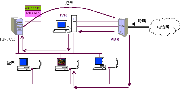 在任何一個步驟中,如客戶選擇了人工坐席,則IVR請求CCM根據(jù)多種情況選擇一個空閑坐席(選擇方法見下文)并控制PBX將呼叫與選擇的人工坐席接通,同時系統(tǒng)在客戶對IVR操作的過程中,已經(jīng)幀測到了客戶所使用的電話號碼、客戶的按鍵信息,系統(tǒng)還記錄有客戶上次的呼叫情況等數(shù)據(jù),這些數(shù)據(jù)基本上可以確定客戶大體關(guān)心的問題,對于老客戶甚至可以初步認(rèn)定呼叫者的身份、年齡、性別、業(yè)務(wù)辦理情況等,因此,話務(wù)員在與客戶談話之前就已經(jīng)了解了相當(dāng)多的信息,并控制選定的坐席屏幕顯示有關(guān)客戶信息,便于直接進(jìn)入正題,提高了效率?蛻襞c坐席的交流過程中,坐席可通過終端請求CCM控制PBX將本次呼叫與其他話務(wù)員(坐席)、專家或業(yè)務(wù)辦公室(如內(nèi)線電話)等接通,當(dāng)坐席人員將呼叫轉(zhuǎn)移到另一坐席或?qū)<視r,系統(tǒng)將在本呼叫中收集的各類數(shù)據(jù)同時轉(zhuǎn)向下一坐席電腦。在坐席人員解答客戶問題時,可將問題及解答情況收集,便于分析坐席人員的業(yè)務(wù)素質(zhì)和問題傾向,從而有針對性地培訓(xùn)坐席人員。對于客戶來講,他可以通過電話按鍵在話務(wù)員、自動語音、傳真、專家和業(yè)務(wù)辦公室之間漫游,系統(tǒng)將記錄客戶漫游的路徑,對于設(shè)計較好的菜單和路經(jīng)來說,客戶的漫游路徑基本上可以反映出其需求,大量客戶的漫游路徑無疑將反映出市場需求。