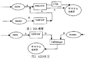 A2D法(Analog to Data) A2D法即事先將呼入呼叫中心的DTMF電話通過VoIP網(wǎng)關(guān)轉(zhuǎn)化為IP電話,再和來自Internet的IP電話一同接入座席代表。A2D法實現(xiàn)相對比較麻煩,但其將絕大部分工作放到計算機(jī)網(wǎng)絡(luò)這個開放的軟件平臺來做,除了有利于更新和開發(fā)外,還能降低成本。同時,這種結(jié)構(gòu)能在地理上和物理上伸縮自如,不僅便于高度集成,而且便于跨地區(qū)構(gòu)建。