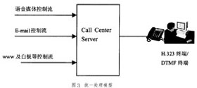目前,IP Call Center實現(xiàn)綜合媒體統(tǒng)一處理的方式已取得比較一致觀點,即如圖3的語音媒體流和IP傳真、Web主頁、Email進(jìn)入座席群前先經(jīng)過一個服務(wù)軟件進(jìn)行統(tǒng)一處理,該服務(wù)軟件一般廠家都稱為Call Center Server(簡稱CCS服務(wù)器),它起著完成呼叫控制、路由處理、與呼叫同步的用戶數(shù)據(jù)管理及信息監(jiān)視等作用。