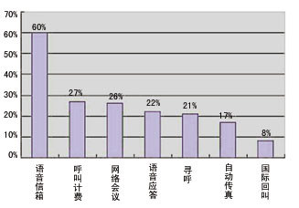 從企業(yè)所使用的CTI應(yīng)用服務(wù)來看:最多的是語音信箱(Voice Mail)為 60%。呼叫計(jì)費(fèi)(Call Accounting)為27%,網(wǎng)絡(luò)會議(Conferencing)為26%。語音應(yīng)答(IVR)為22%。由于CTI在我們國家,這一兩年才得到比較快的發(fā)展,所以應(yīng)用層次還不是很高。還有一個(gè)原因是有些CTI技術(shù)的應(yīng)用在發(fā)展企業(yè)的核心業(yè)務(wù)方面作用不大,所以像Audio TEX、Powers Dialers等一些應(yīng)用就比較少。