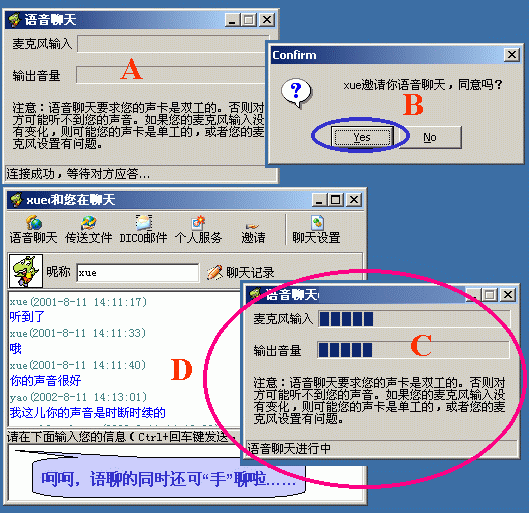 在好友窗口內(nèi)單擊某"在線好友頭像"后選"語音聊天"命令(或在即時(shí)聊天窗口中點(diǎn)按"語音聊天"按鈕)后,主動方彈出"正等待對方應(yīng)答窗口提示";而被叫方會彈出"應(yīng)答與否的窗口","YES"后雙方即可聊了(下圖9)。而且,它不受防火墻的限制(下圖就是我與一個(gè)在防火墻后的朋友的聊天界面)。在這一點(diǎn)上,QQ就望塵莫及了!