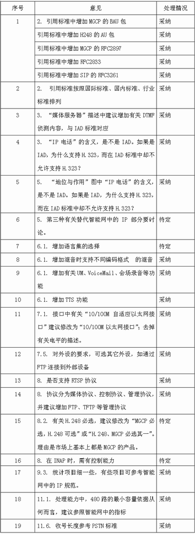 附表:8月1日~2日,網(wǎng)絡(luò)與交換標(biāo)準(zhǔn)研究組對于“基于軟交換的媒體服務(wù)器的技術(shù)要求”的征求意見選登。