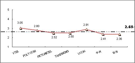 為深入了解和對比被調(diào)查者對不同品牌視頻會議終端系統(tǒng)產(chǎn)品的認知程度,本次調(diào)查將被調(diào)查者對各主要品牌的了解程度劃分為五個檔次,對不同的檔次賦予不同的分值,分別為“非常了解(5分)”、“了解(4分)”、“一般(3分)”、“不了解(2分)”、 “非常不了解(0分)”,同時綜合考慮以購買用戶擁有的品牌分布,借以比較不同品牌在認知度上的差異。統(tǒng)計結果顯示,目前在中國市場上,用戶對主要視頻會議終端系統(tǒng)產(chǎn)品品牌的了解程度的平均值為2.65,各品牌認知度分值見圖6。其中:VTEL品牌的知名度最高,指標值為3.05,超過了“一般”了解水平;其次為VCON品牌,指標值為2.91;POLYCOM的知名度指標值為2.8,處于第三位。除VTEL品牌外,其他主要品牌的知名度還都處于低于“一般”了解水平階段,反映出產(chǎn)品的市場認知還較低。