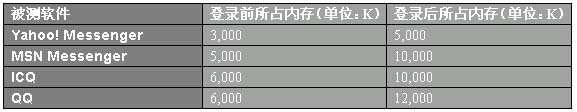 在使用Windows平臺下的PC也只有內(nèi)存還稍顯珍貴,所以就這四款軟件所占用的內(nèi)存進(jìn)行了對比。結(jié)果如下:Yahoo! Messenger所占的內(nèi)存,無論在登錄前后都是最小的;第二名,MSN Messenger在功能龐大的情況下,能做得如此精巧實屬難得;第三名,ICQ從2000版開始對內(nèi)存的占用始終比較穩(wěn)定,只是在出了中文界面后稍高一些;第四名,QQ啟動出現(xiàn)登錄界面時還沒顯出味口有多大,不想登錄后隨著系統(tǒng)信息和Flash廣告等傳到客戶端占用內(nèi)存的峰值竟然能達(dá)到15,000K,相信內(nèi)存小一些的機器在QQ登錄后就要多等一會兒了。
