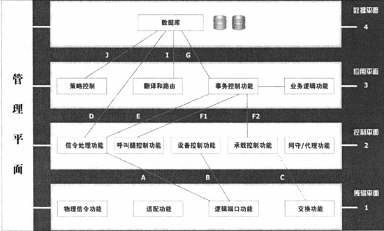 控制平面處于第二層,提供控制功能,如信令處理、承載連接控制、設(shè)備控制、呼叫腿(Leg)控制、網(wǎng)守(Gatekeeper)和代理信令等功能。其中:參考點(diǎn)D位于信令處理功能和數(shù)據(jù)庫功能之間,采用TCAP信令;參考點(diǎn)E在信令處理功能和會(huì)話控制功能之間,采用TCAP信令,用于IN請(qǐng)求等傳送,業(yè)務(wù)邏輯對(duì)呼叫的控制等消息傳送;參考點(diǎn)F1、F2分別采用呼叫控制API和承載連接控制API,如TAPI、JTAPI等。控制平面與外界的接口2采用H.323(H.225/H.245)、SIP、TCAP(TCAP/SCCP/M3UA/SCTP/IP)等協(xié)議和信令。