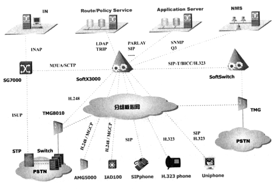 總之,基于IP軟交換的網(wǎng)絡(luò)是一個(gè)融合網(wǎng)絡(luò),包括PSTN/ISDN、H.323、ATM/IP等各種網(wǎng)絡(luò)。SIP協(xié)議是NGN多媒體通信協(xié)議,用于軟交換、SIP服務(wù)器和SIP終端之間的通信控制和信息交互,擴(kuò)展的SIP-T可使SIP消息攜帶ISUP信令;在需要媒體轉(zhuǎn)換的地方可設(shè)置媒體網(wǎng)關(guān),H.248/Megaco為媒體網(wǎng)關(guān)控制器(MGC),用于控制媒體網(wǎng)關(guān),完成媒體轉(zhuǎn)換功能,它并不負(fù)責(zé)呼叫控制功能;H.323也是多媒體通信協(xié)議,它比SIP、H.248/Megaco的發(fā)展歷史更長,是一項(xiàng)復(fù)雜的協(xié)議,升級(jí)和擴(kuò)展性不是很好,SIP+H.248/Megaco可取代H.323,為了與H.323網(wǎng)絡(luò)互通,NGN必須支持該項(xiàng)協(xié)議;SIGTRAN用于解決IP網(wǎng)絡(luò)承載七號(hào)信令的問題,它允許七號(hào)信令穿過IP網(wǎng)絡(luò)到達(dá)目的地;BICC可使ISUP協(xié)議在不同承載網(wǎng)絡(luò)(ATM、IP、PSTN)上傳送。