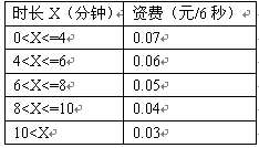 例3,國內(nèi)長途話費在時長不超過4分鐘的情況下,按0.07元/6秒收;超過4分鐘但不超過6分鐘,統(tǒng)一按0.06元/6秒收。怀^6分鐘但不超過8分鐘,統(tǒng)一按0.05元/6秒收。怀^8分鐘但不超過10分鐘,統(tǒng)一按0.04元/6秒收;超過10分鐘,統(tǒng)一按0.03元/6秒收取。
