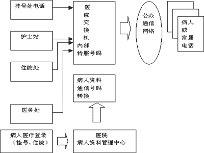 病人資料數(shù)據(jù)庫保存的病人資料均與病人住院、就診代號對應(yīng),醫(yī)護(hù)人員因工作需要欲與病人或家屬聯(lián)系時(shí),使用本部門的電話通過呼叫中心獲得使用權(quán)限。交換機(jī)給醫(yī)院內(nèi)部指定一個(gè)"特服號碼",負(fù)責(zé)與病人通信。